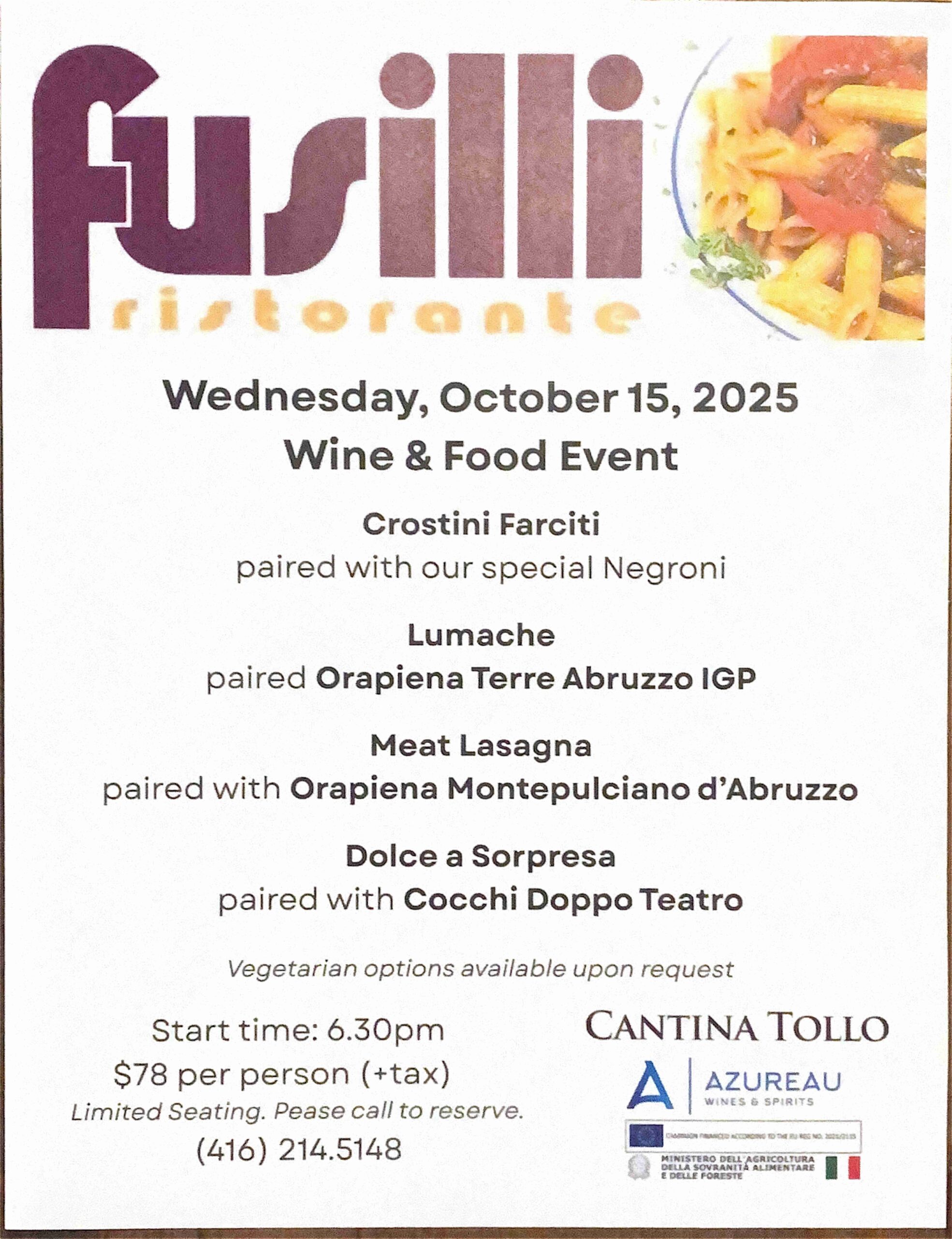 Located on Queen Street East in Riverside, Fusilli is a small, casual, Corktown neighbourhood Italian restaurant. It specializes in authentic Southern Italian cuisine. Select from a variety of salads, pasta, stone oven pizzas, meat dishes, and seafood for lunch during the weekdays and dinner six nights of the week.